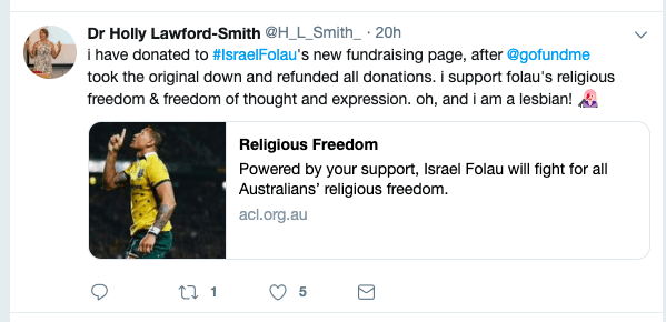 It is thrilling that so many ordinary people are so fed up with the Woke Police that they are doing what they can to fight back — including donating to Folau. This is the same kind of thing that last month saw the conservative party in Australia returned to office in a shock election expected to be a Labour victory. Ordinary people get so sick of these bullies, and do not want to see them in power.